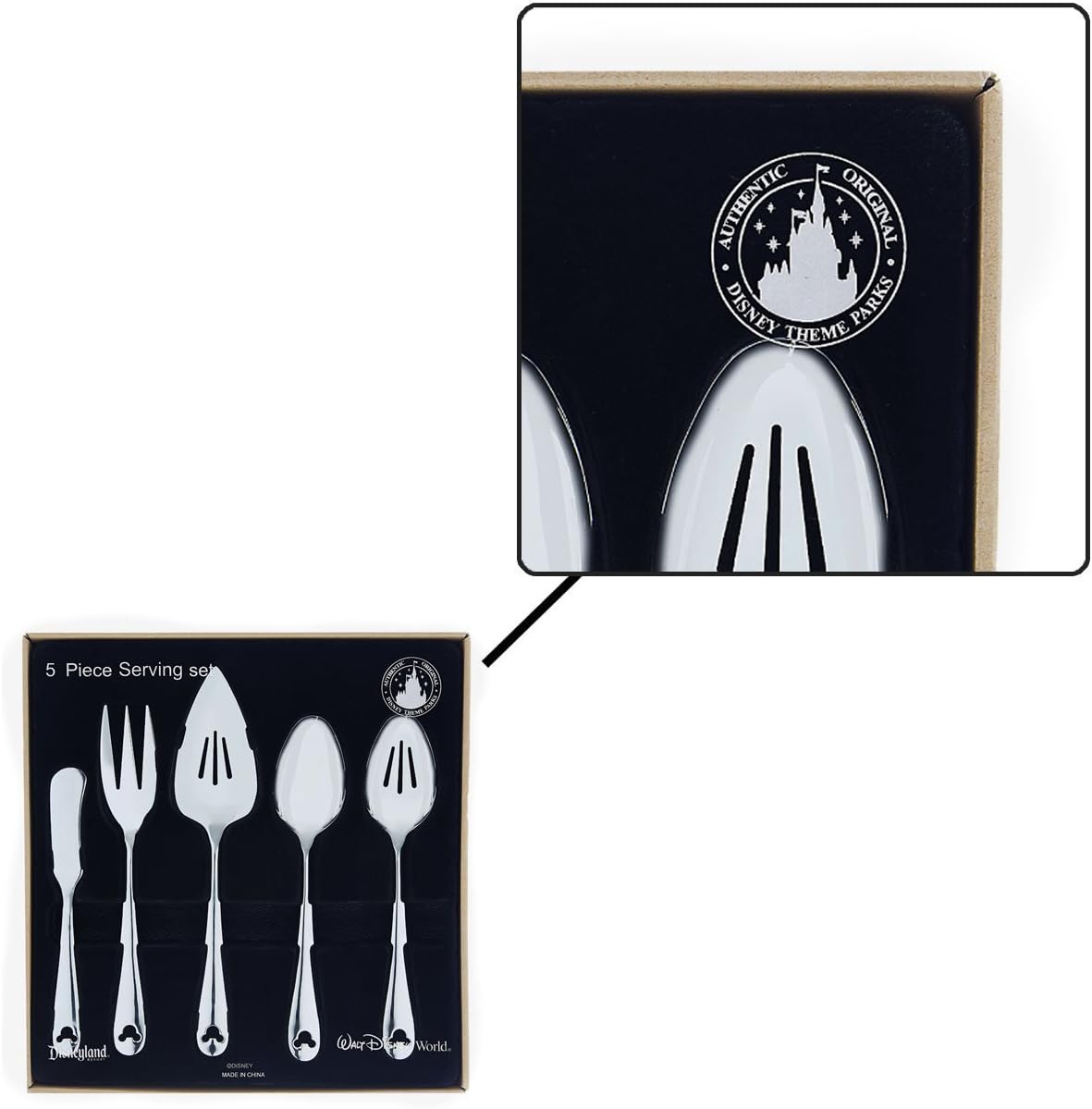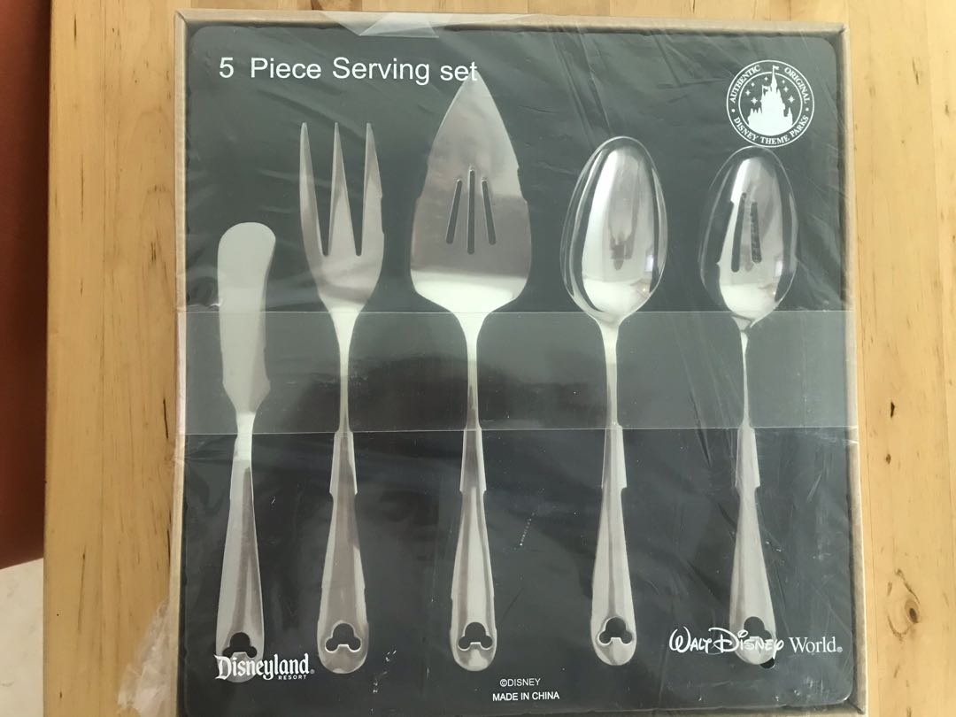 Serve up some delicious desserts with this awesome Mickey Icon serving set. Genuine Original Authentic Disney Store Five-piece serving set Includes knife fork spoon slotted spoon and slotted cake server Comes boxed Part of the Gourmet Mickey kitchen collection. They have a silvertone finish on one end and satin finish handles.