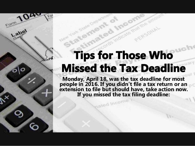 What to Do if You Missed the Tax Deadline. Maybe youve been buried by a big project at work dealing with a family crisis or illness or just so overwhelmed by the task of gathering all your tax documents and receipts that the tax deadline came and went. Now you dont know what to do.
