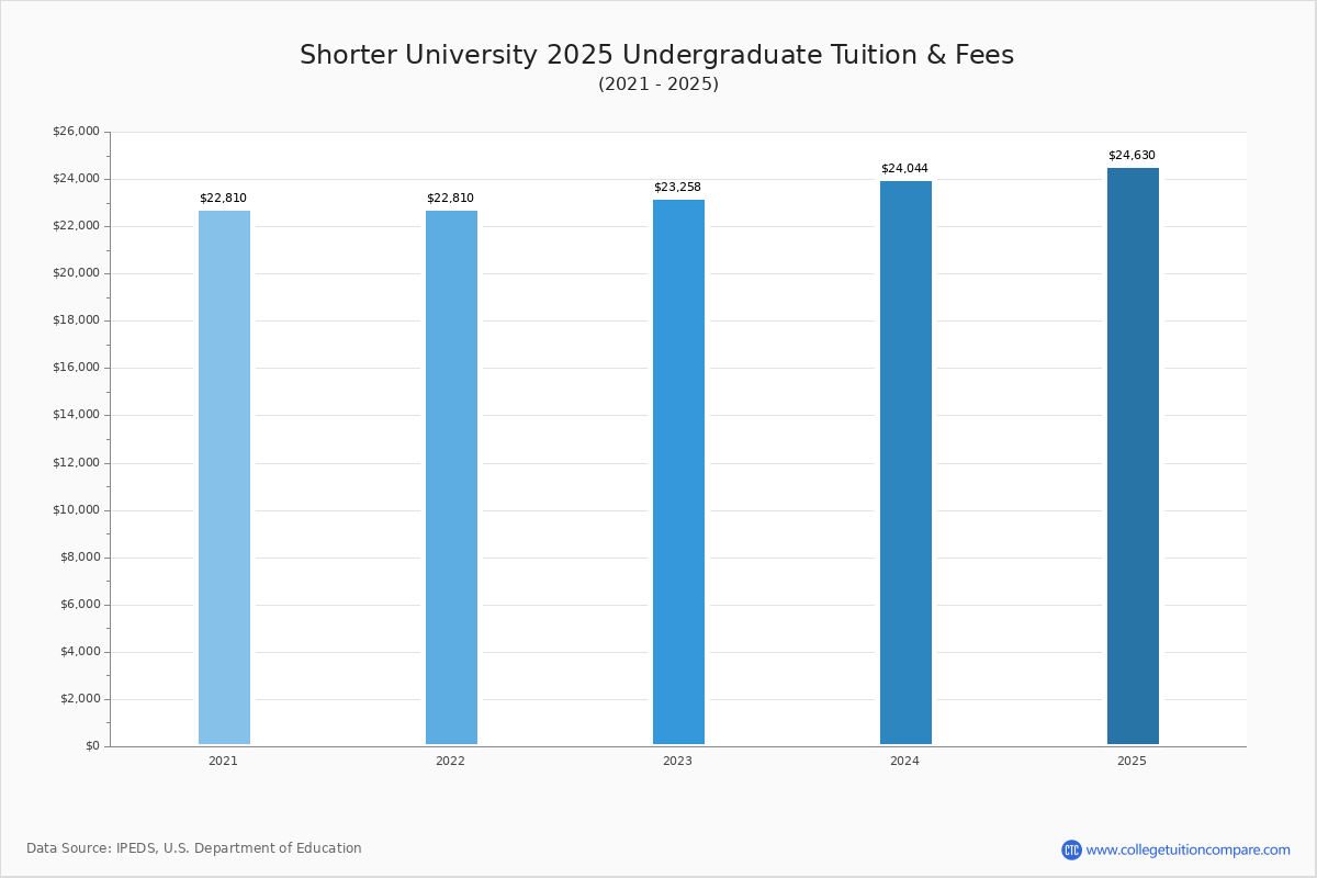 The annual list price to attend Shorter University on a full time basis for 20182019 is 35130 for all students regardless of their residency. This fee is comprised of 21940 for tuition 9400 room and board 1200 for books and supplies and 430 for other fees. Shorter Universitys tuition is 22810.