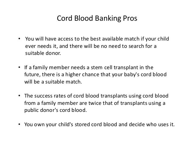 Heres one reason you might consider private cord banking. List of Pros of Cord Blood Banking 1. Umbilical blood has numerous advantages over bone marrow when it comes to stem cell transplant.