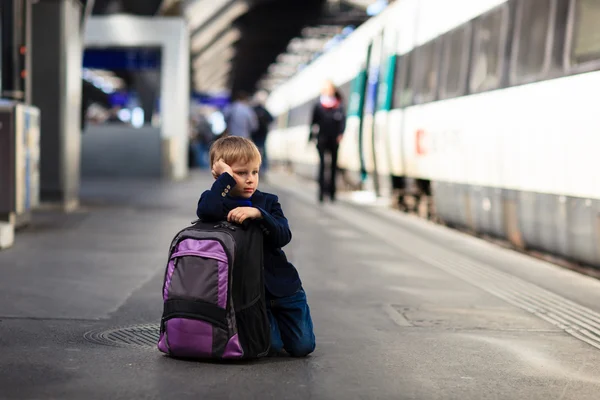 But I know. Little boy on a railway station waiting for the train with vintage suitcase.