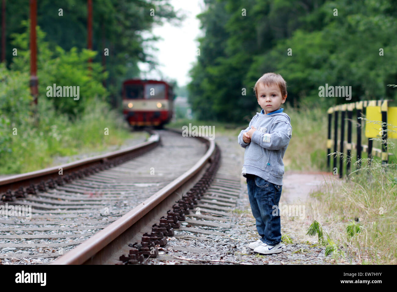 Little Boy On A Railway Watching A Train Passing By Stock Photo Alamy