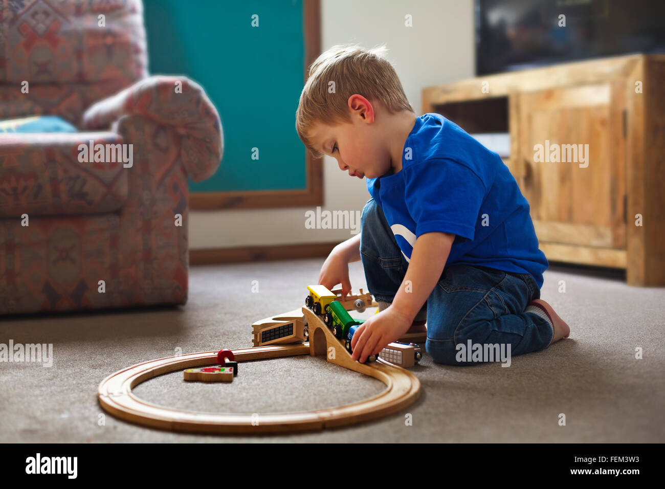 A Little Boy Playing With A Train Set Stock Photo Alamy